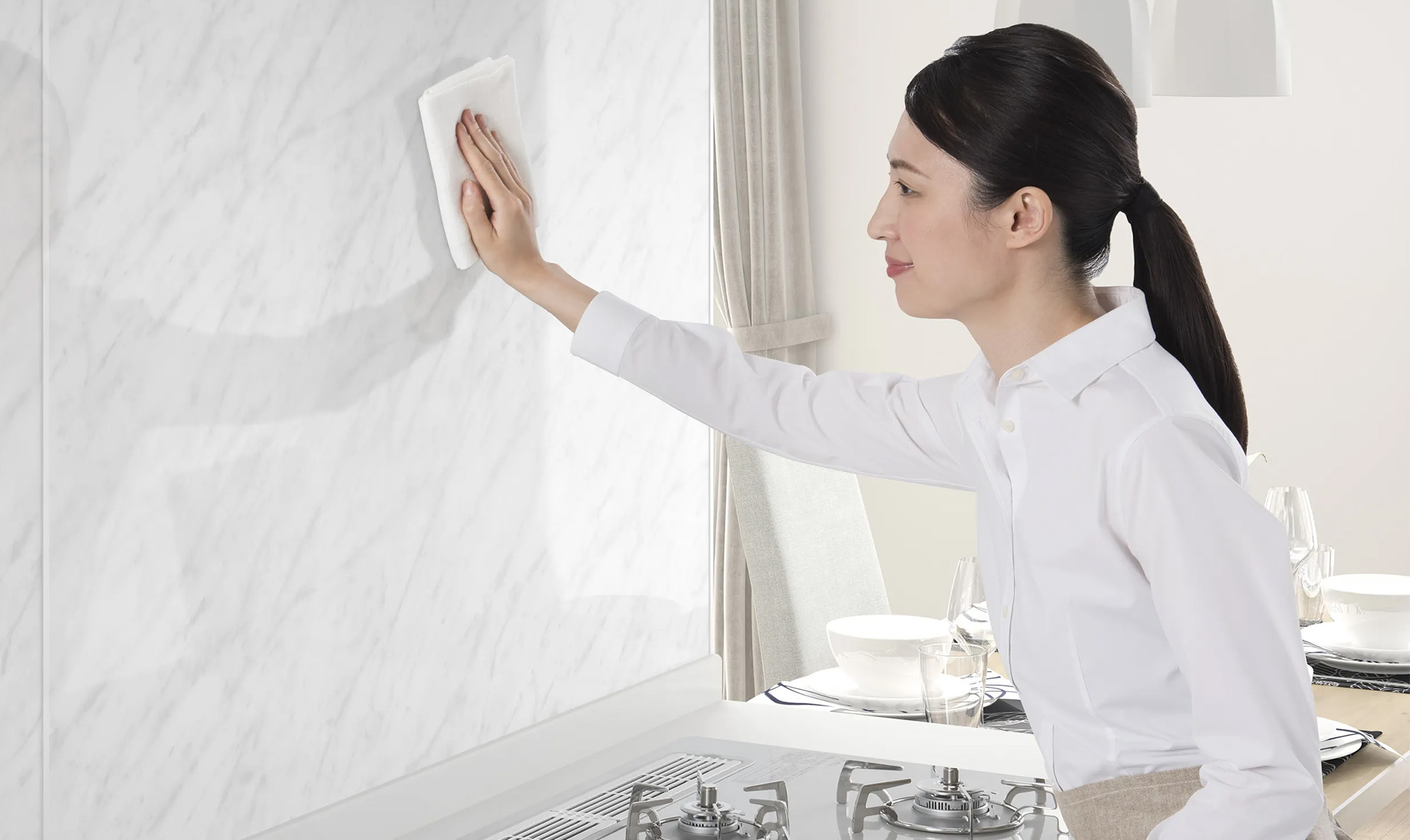高品位琺瑯的表面為玻璃質。不易粘附污垢,頑固的油污也只需用水輕輕擦拭便可去除,廚房始終保持熠熠生輝。